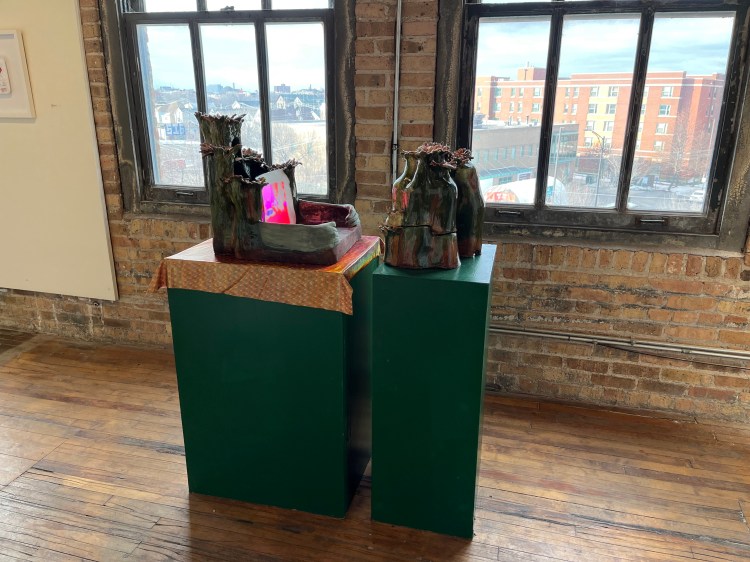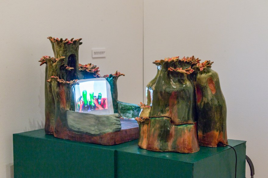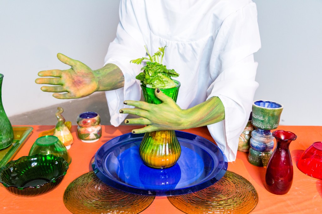 Bibere Viridi Sanctum is a video projection of a figure making a smoothie, in the fashion of a religious ceremony, in a plant-inspired stage. The ceramic object has a stage floor with green hands that are each in a kneeling position. The floor and arms lead to a white flat surface that acts as the screen. The religious center’s back has five colorful stalks of petals, with dark greenish-brown voids. The projector is hidden in a smaller version of the plant, centered in a round shape. The viewer must listen to the ingredients being listed whilst wearing headphones. The point of this piece is to make apparent that the intention of subscribing to a religion, or spirituality, is the same as our relationship to adopting an eating lifestyle. It is all ritualistic behavior. The sentence for Bibere Viridi Sanctum is “I Demonstrate For The Possibility That You Will Have A Better Life”.