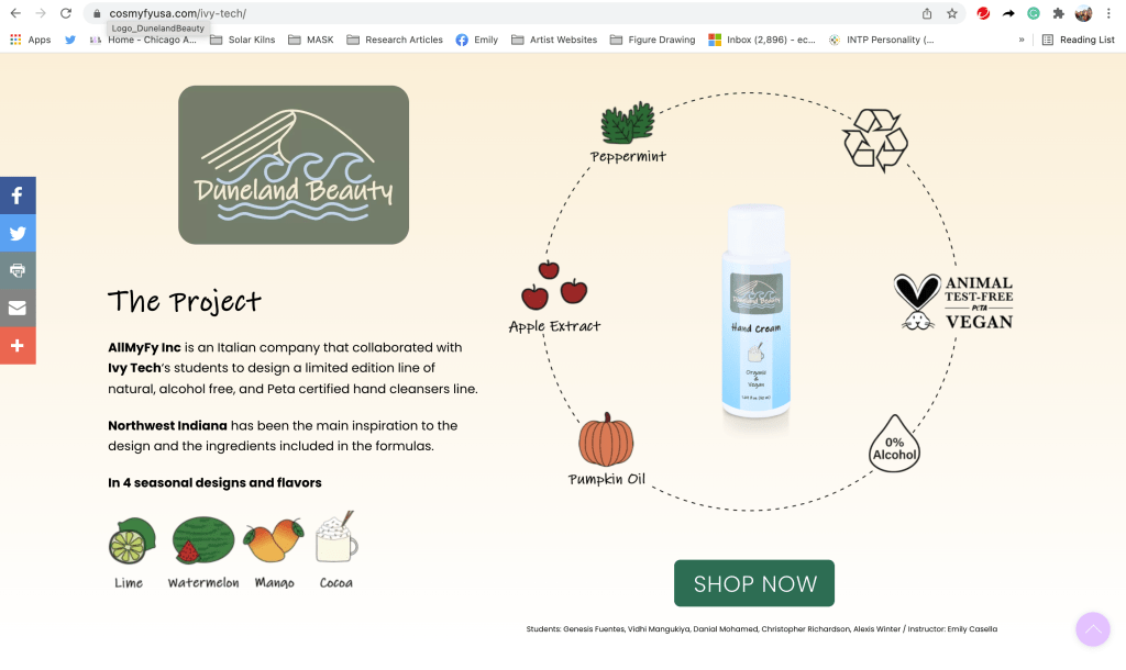 Summer 2021 Instructor for IvyTech Valparaiso Graphic Design/Marketing collaboration with COSMYFY USA new branch of an all-natural, green cosmetic company Phytolab, and COSMYFY Milano, Italy, where students designed and came up with 12 different body-care products
