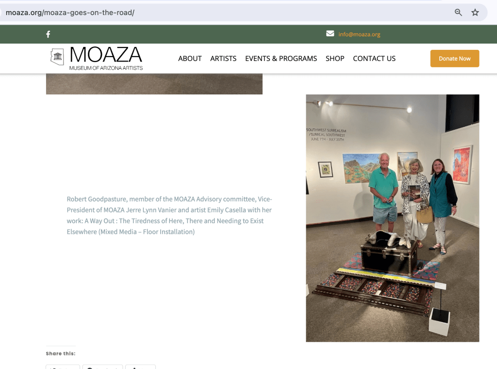 MOAZA Goes On the Road! Museum of Arizona Artists wrote a blogpost about the Southwest Surrealism/Surreal Southwest Reception, which features a photograph of Emily Casella with the Vice President of MOAZA. https://moaza.org/moaza-goes-on-the-road/
