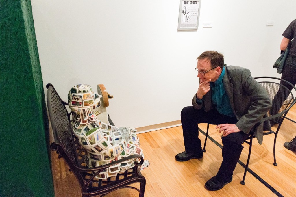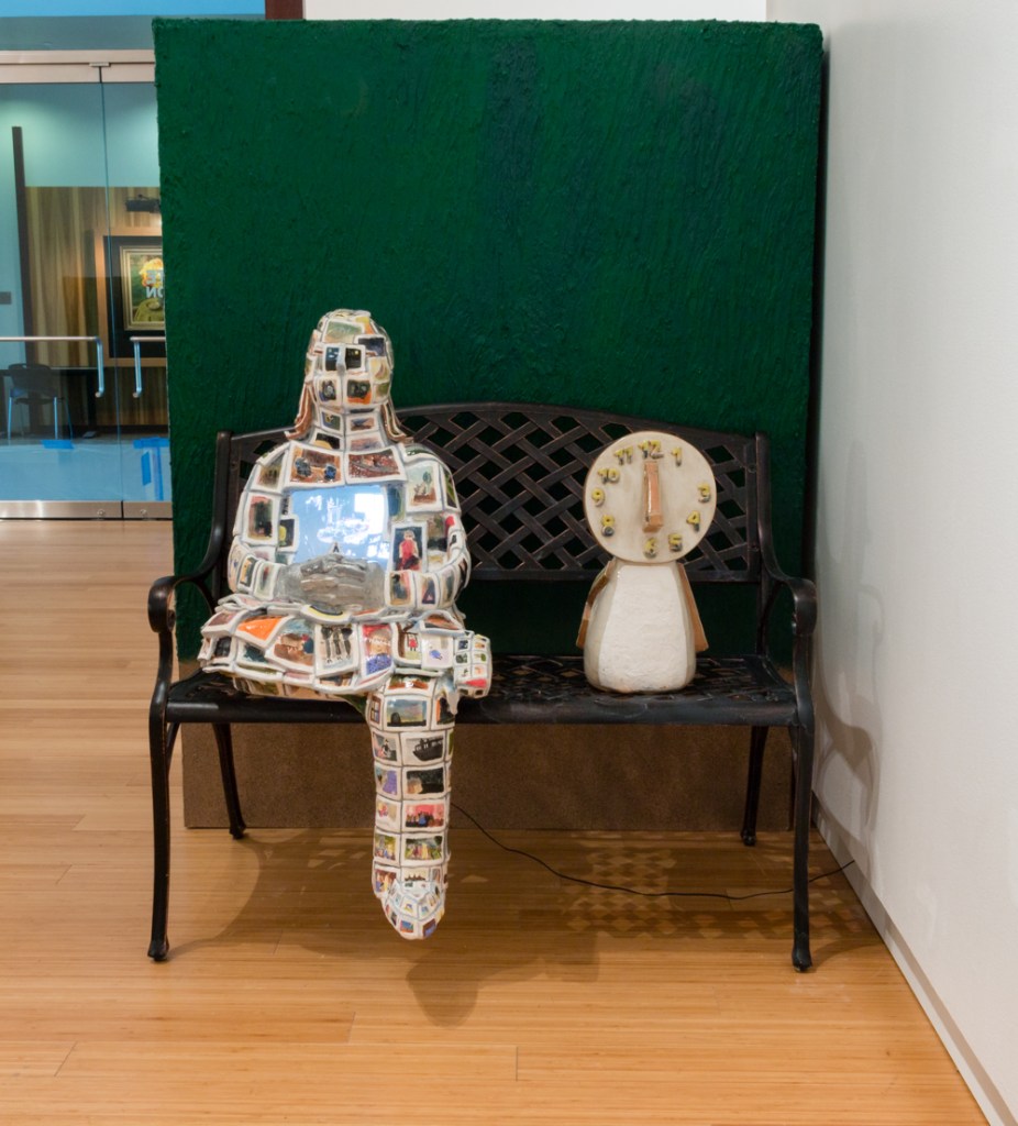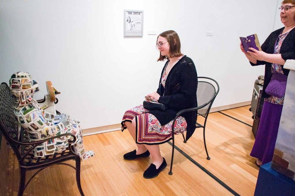 The Time Critter is a fictitious product, I made to investigate advertisement, communication, and self-adornment in terms of solidifying the remembrance of one’s life through photographs. It is a product made to take records of a person’s life so they can live life without having to constantly stop to take photographs themselves. It gives the user a pile of photographs that dictate how many memories the critter will take of the person. Its counterpart, The Consumer, is the ceramic photograph human result of what happened when The Time Critter came into their life. The Consumer happens upon a flyer for The Time Critter. When the viewer sits across from the park bench on a garden chair to watch the video in its chest cavity, they are privy to The Consumer’s individual world. They can witness what caused the state of the statue.